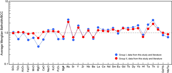图2 腾冲地体早白垩世深部地球动力学过程 (4)相比于第一组岩石,第二组岩石的平均组成更加接近于平均大陆地壳(图3),表明幔源物质加入到壳源熔体,可能是碰撞带大陆地壳生长的一种有效的方式。 图3 勐连岩基中两组岩石的平均地球化学组成 上述研究为Nd-Hf同位素耦合和解耦的大型花岗质岩基成因研究提供了直接的岩石学和地球化学证据,强调了花岗岩的Nd-Hf同位素解耦特征是由于继承了具有Nd-Hf同位素解耦特征的幔源物质,指出幔源物质加入古老壳源熔体可能是碰撞带大陆地壳生长的一种有效机制。