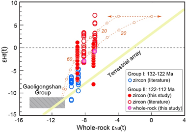 汇聚板块边缘广泛发育有大型花岗质岩基,这些大型岩基均具有中-酸性的平均地球化学组成,与平均大陆地壳的安山质-英安质组成相当。因此,汇聚板块边缘大型岩基的成因研究对于厘定富硅大陆地壳的成因机制具有重要意义。已有研究显示,虽然显生宙和元古代的岩石通常具有耦合的Nd-Hf同位素组成,但也有部分幔源和壳源岩石显示解耦的Nd-Hf同位素组成。对这种解耦的原因,前人提出了多种成因解释。研究的关键在于能否在单个研究对象中识别出Nd-Hf同位素组成既耦合又解耦的岩石。 针对这一科学问题,中国地质大学(北京)“岩浆作用与青藏高原形成”团队的博士后谢锦程,在导师朱弟成教授的指导下,对滇西腾冲地体东部的勐连岩基开展了深入研究,取得了以下重要认识: (1)根据锆石U-Pb年龄和地球化学特征将勐连岩基分为两组:第一组岩石主要由花岗岩类组成,锆石U-Pb年龄为132-122 Ma,锆石εHf(t)和全岩εNd(t)值分别为-11.7 to -4.2和-10.1 to -8.9;第二组岩石包括辉长岩-花岗岩,锆石U-Pb年龄为122-112 Ma,具有升高的锆石εHf(t)值(-7.8 to +7.1),全岩εNd(t)和εHf(t)值分别为-9.0 to -6.9和-3.1 to -1.0。 (2)第一组岩石具有耦合的Nd-Hf同位素组成,主要来源于Nd-Hf同位素耦合的富钾变中基性岩石的部分熔融,而第二组岩石中花岗岩具有解耦的Nd-Hf同位素组成,可能来源于古老壳源熔体与Nd-Hf同位素解耦的幔源物质的混合(图1)。